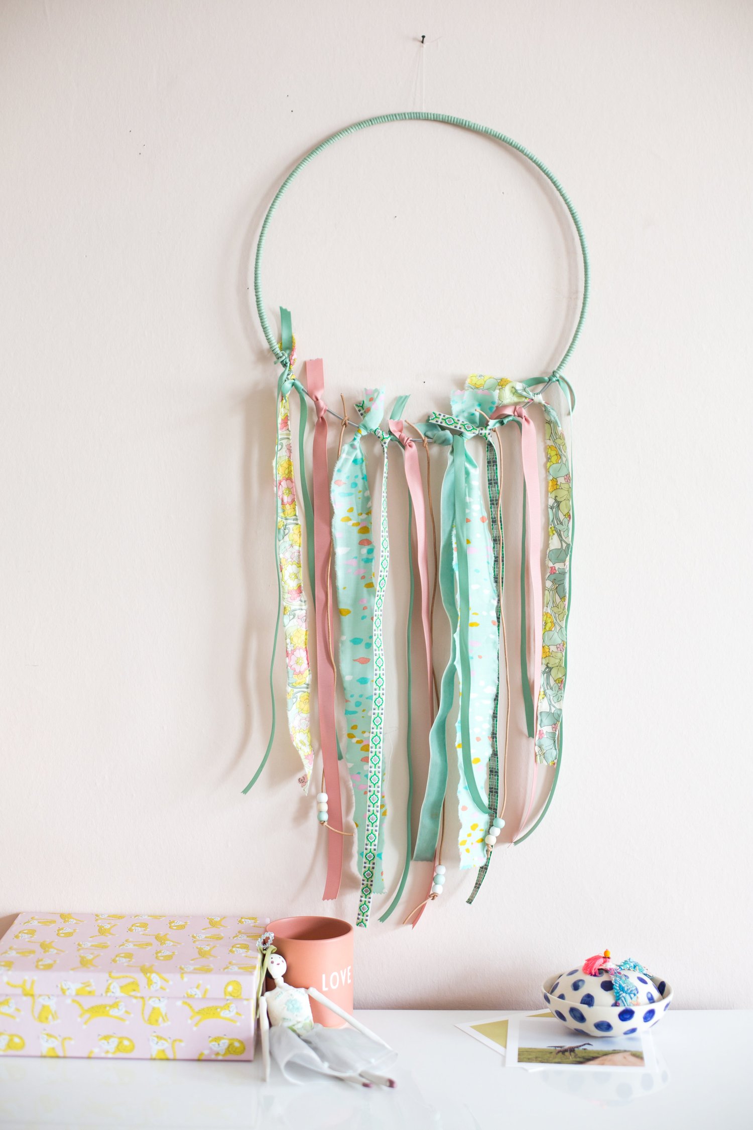 Make a pattern on the hoop using your yarn, in anyway you like! Do your thing! Then, add some leather cord with beads on it. You can add more than one cord, again, be creative. On the bottom, hang your ferns in different lengths using nylon cord. Could this be any easier?