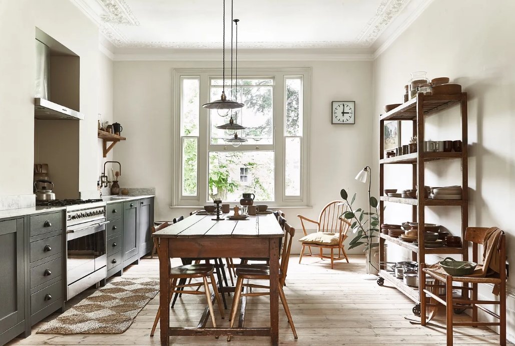Mixing modern and vintage elements in the kitchen can be a bit trickier than in other rooms, but the result is worth the effort. In the photo above, the cupboards and long table were sourced from a Belgian antiques dealer—they originally came from a monastery! The kitchen’s decorative plaster ceiling is beautifully highlighted with Farrow & Ball’s Slipper Satin paint, while the modern marble worktop adds a contemporary touch to the space.