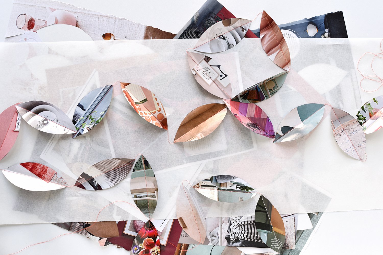 As a small handicraft and DIY for you, I browsed my interior magazines for colors to match the table setting and made a simple leaf-shaped template and cut out a lot of paper leaves. Afterwards I sewed them together one by one using my sewing machine putting six single leaves aside for my guests as the place cards.