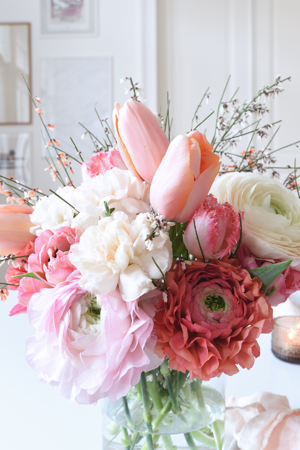 The materials and props that I chose this time around are glass, vases and tealight holders, as it helps to create a light and fresh feeling, which is exactly what we want after dark winter months, right!? You will also see fine linen.
