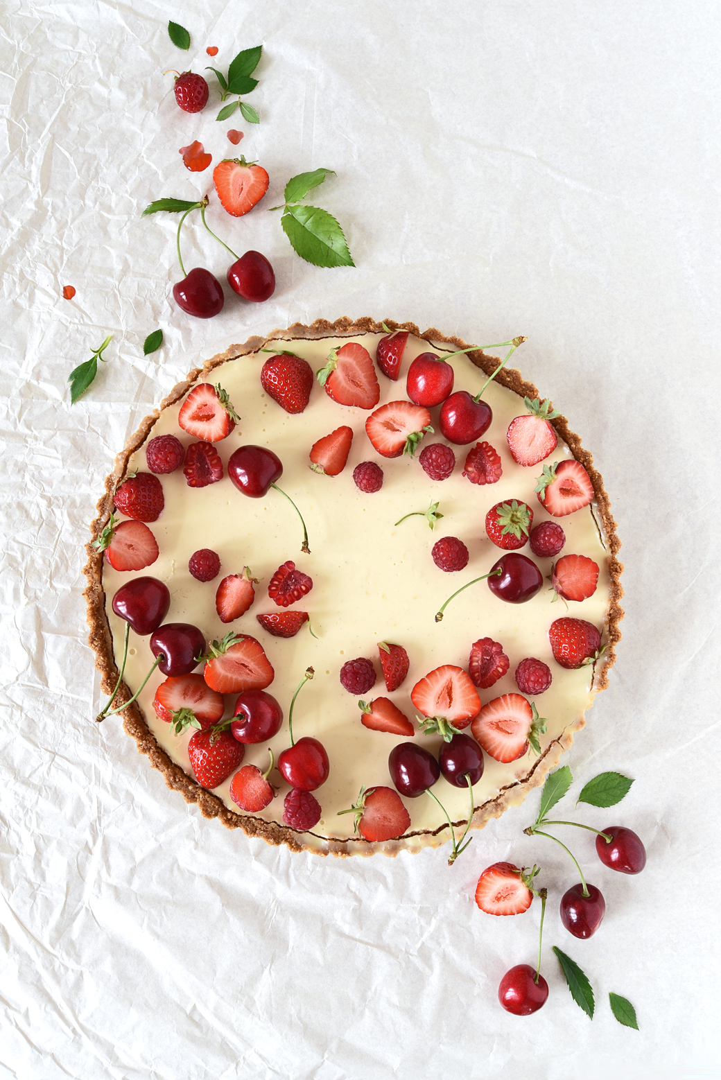 I made a lemon tart following THIS recipe on Half Baked Harvest. Tieghan Gerard called it, “No fuss lemon tart ... super easy, yet delicious and pretty too“, which says it all! I was also inspired by her beautiful cake styling very much and tried the berry topping that she did by simply adding some cherries to the strawberries and raspberries. Have a look at her blog, it is one of my favorites!