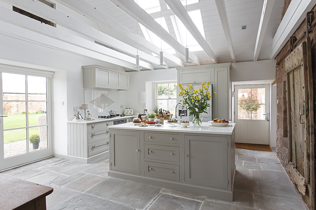 “I love the juxtaposition between old and new,” Arlene adds. Finding the original, time-worn flagstone floors in the kitchen was a joyous moment,” she reveals. “The kitchen floor had been covered in shiny black tiles and paired with red gloss-painted Artex walls and a dark pine kitchen. Some of the flagstones were damaged but we were able to repair them.”