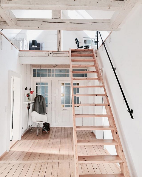 Sandra is not a designer (shocking to me, she is a pure natural talent at design!) and doesn’t even work in the design industry, yet she lives like a designer would - in a home that is so carefully edited and just beautiful. I’ve actually been to her house (just last week), so I can tell you that she really does live this way, it’s not just “Instagram Perfect”, her home is so organized and nicely styled. It was great to be inside the space and also to meet Sandra in person. Now, let me show you her fabulous home at the top of an old building, where she and her husband have the “attic” with two floors of light-filled living space. Imagine soaring ceilings, exposed beams painted in white, concrete floors in the bathroom and kitchen, natural hardwood throughout the rest of the house, a balcony overlooking the city, skylights, and a big kitchen that opens into the dining area.