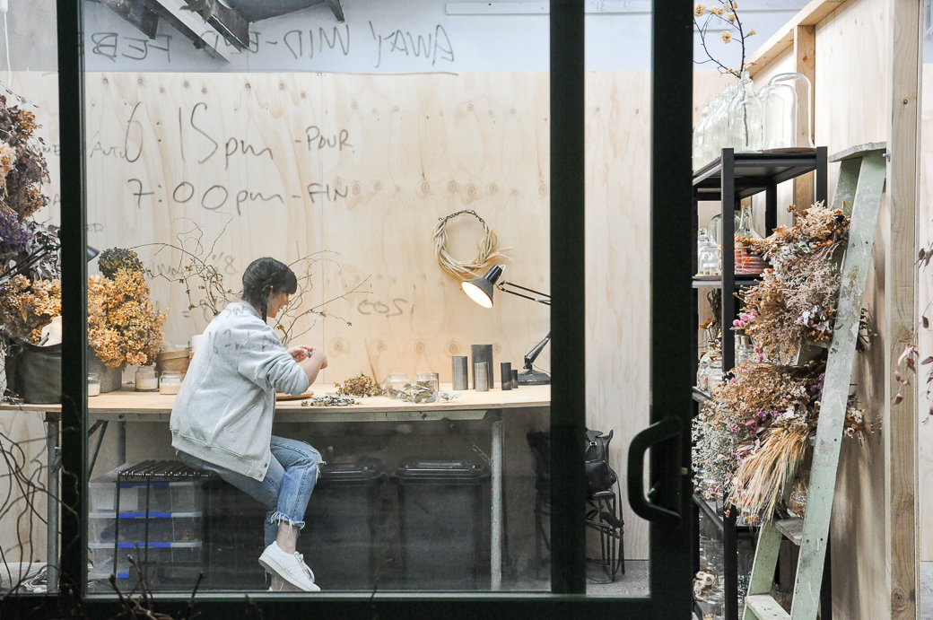 The idea struck Antonia when she saw the waste left behind from her fresh floral commissions. She experimented with the scrap flora she dried, until she found her signature minimalist style, treating each consignment as a sculpture. Watching her at work is simply mesmerizing.